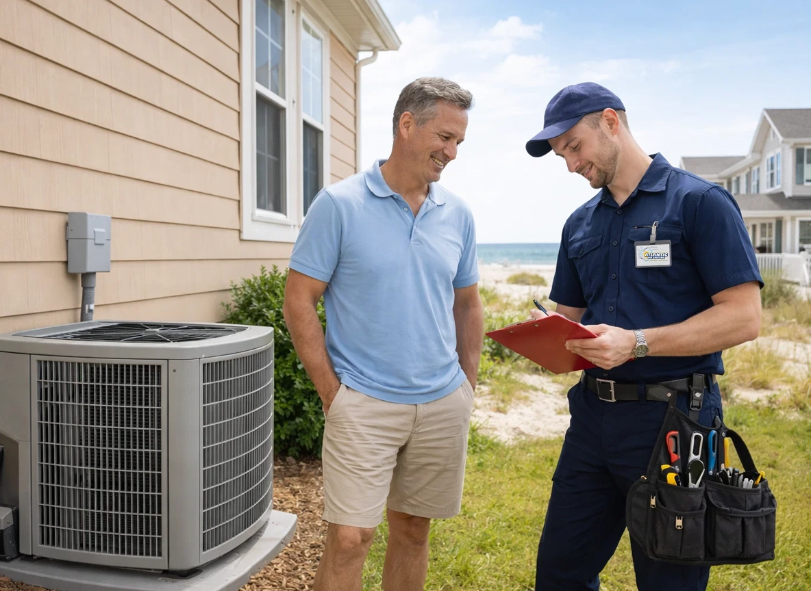 Homeowner and HVAC technician explaining why heating bills stay high even after lowering thermostat in Seaside Park NJ